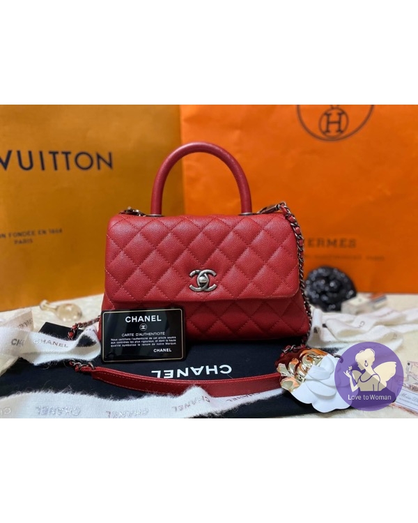 香奈兒 紅色荔枝牛皮復古銀釦 鍊子可拆 CoCo handle 24