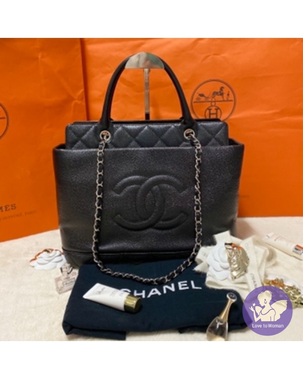 香奈兒高端款黑色荔枝牛皮大雙C銀鍊手提肩背包