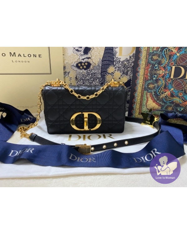 DIOR CARO黑色 金釦 柔軟 藤格紋圖案小牛皮 小號手提肩背包