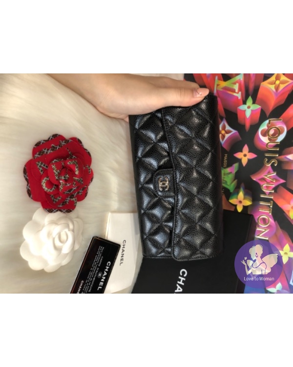 CHANEL 經典菱格紋荔枝牛皮銀釦長夾(黑