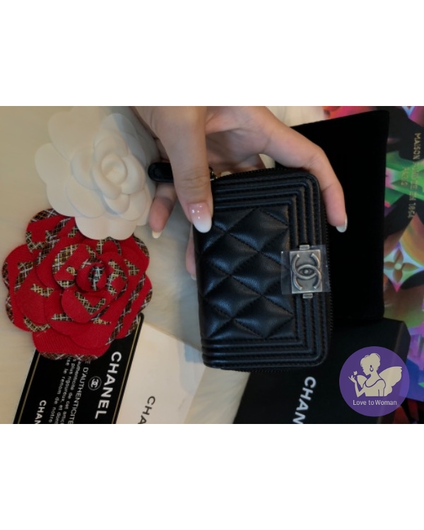 CHANEL 經典菱格紋羊皮仿舊銀釦拉鍊零錢包(黑)
