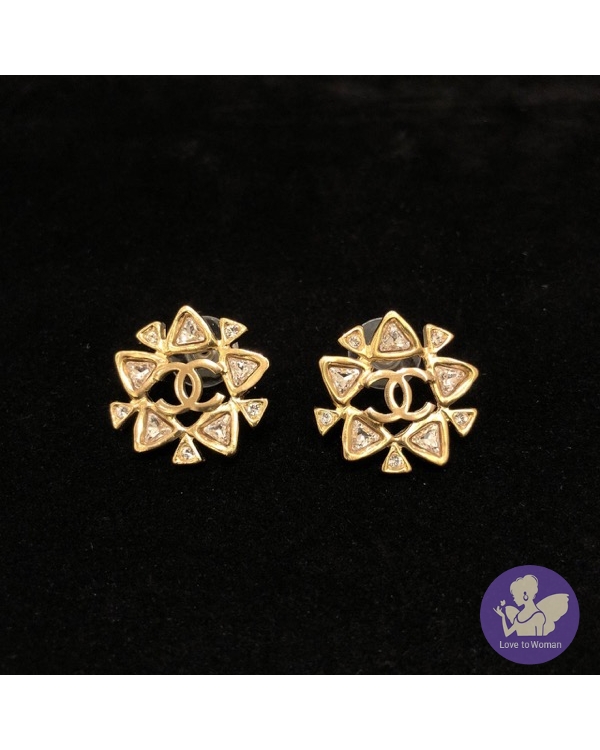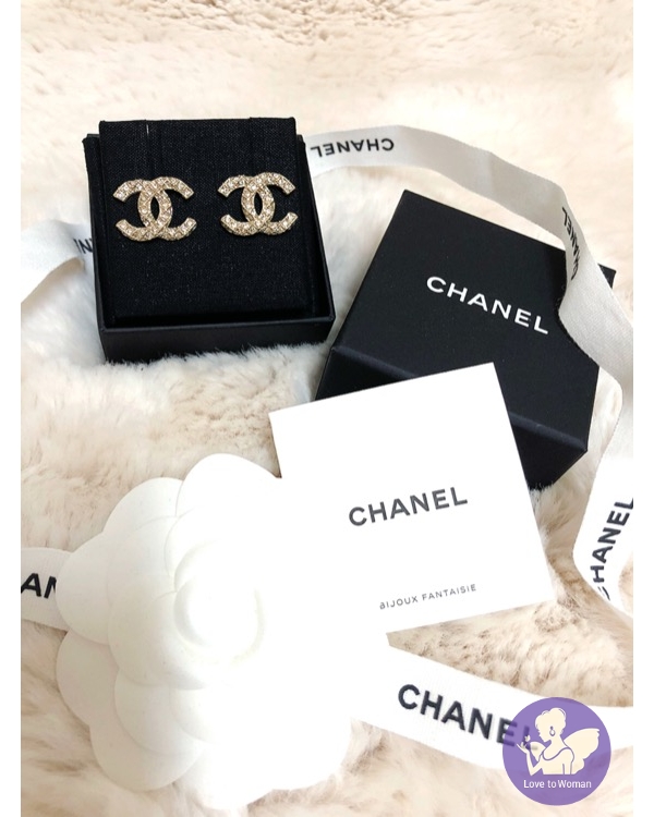 Chanel➰2020秋冬。香檳金色菱格紋水鑽logo耳環