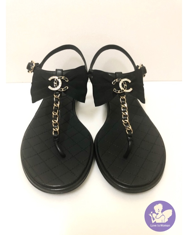 ​CHANEL 小香 香奈兒 2020早秋系列 新款 黑色雙C logo 皮穿鍊配水鑽 蝴蝶結 夾腳 涼鞋 38號 全新✨