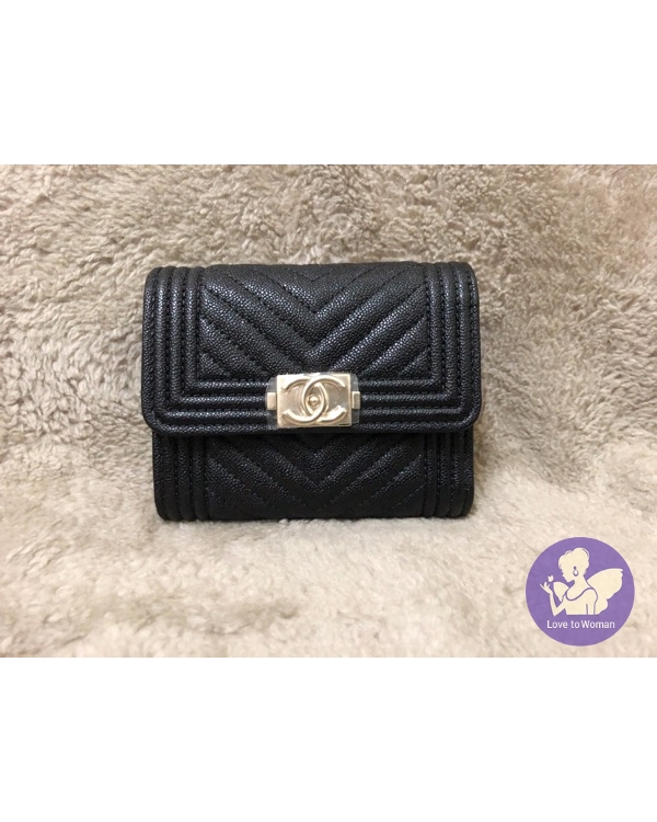 ​CHANEL 香奈兒 小香 經典 boy 淡金扣 黑色荔枝牛皮 山形紋 3折 短夾✨