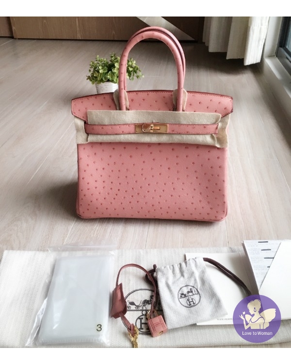 Birkin 30 鴕鳥皮 (金扣) 乾燥玫瑰色